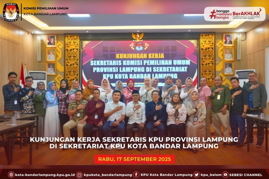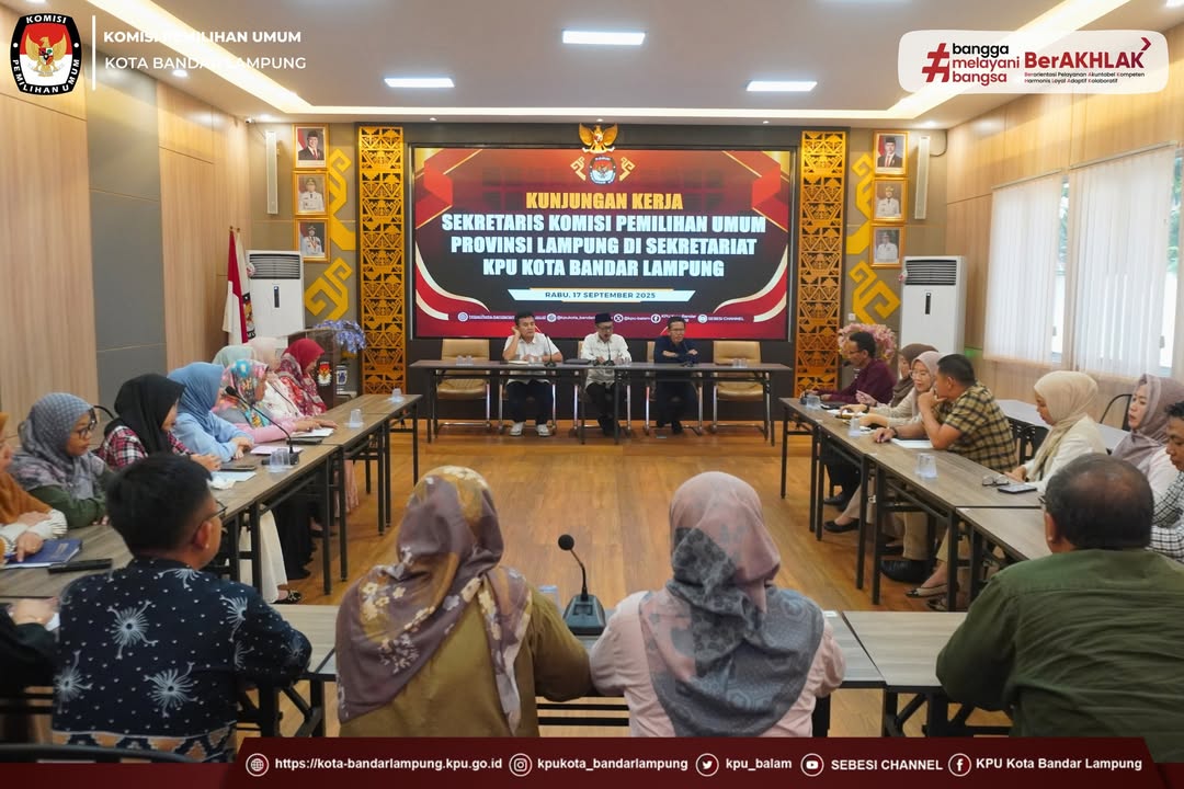 Komisi Pemilihan Umum (KPU) Kota Bandar Lampung menerima kunjungan kerja Sekretaris KPU Provinsi Lampung, Bapak Arif Ma’ruf, S.Ag., M.A.P., bersama jajaran sekretariat KPU Provinsi Lampung di Aula KPU Kota Bandar Lampung, Rabu (17/09/25).