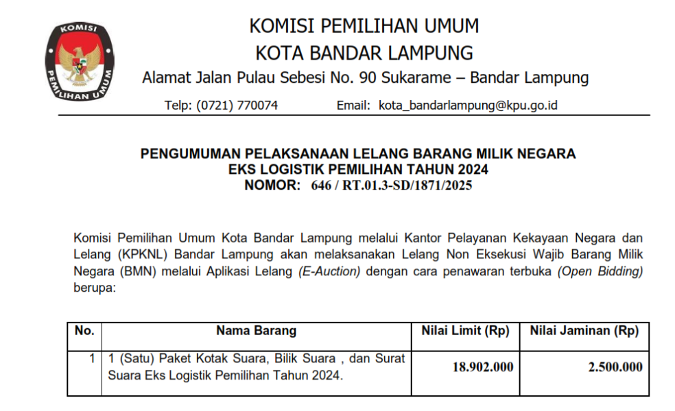 PENGUMUMAN PELAKSANAAN LELANG BARANG MILIK NEGARA EKS LOGISTIK PEMILIHAN TAHUN 2024