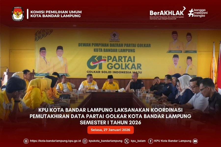 Komisi Pemilihan Umum (KPU) Kota Bandar Lampung melaksanakan kegiatan koordinasi dan silaturahmi terkait Pemutakhiran Data Partai Politik Berkelanjutan Semester I Tahun 2026 ke DPD Partai Golkar Kota Bandar Lampung sebagai upaya memperkuat komunikasi serta memastikan tertib administrasi kepartaian sesuai dengan ketentuan peraturan perundang-undangan. (27/01/26)