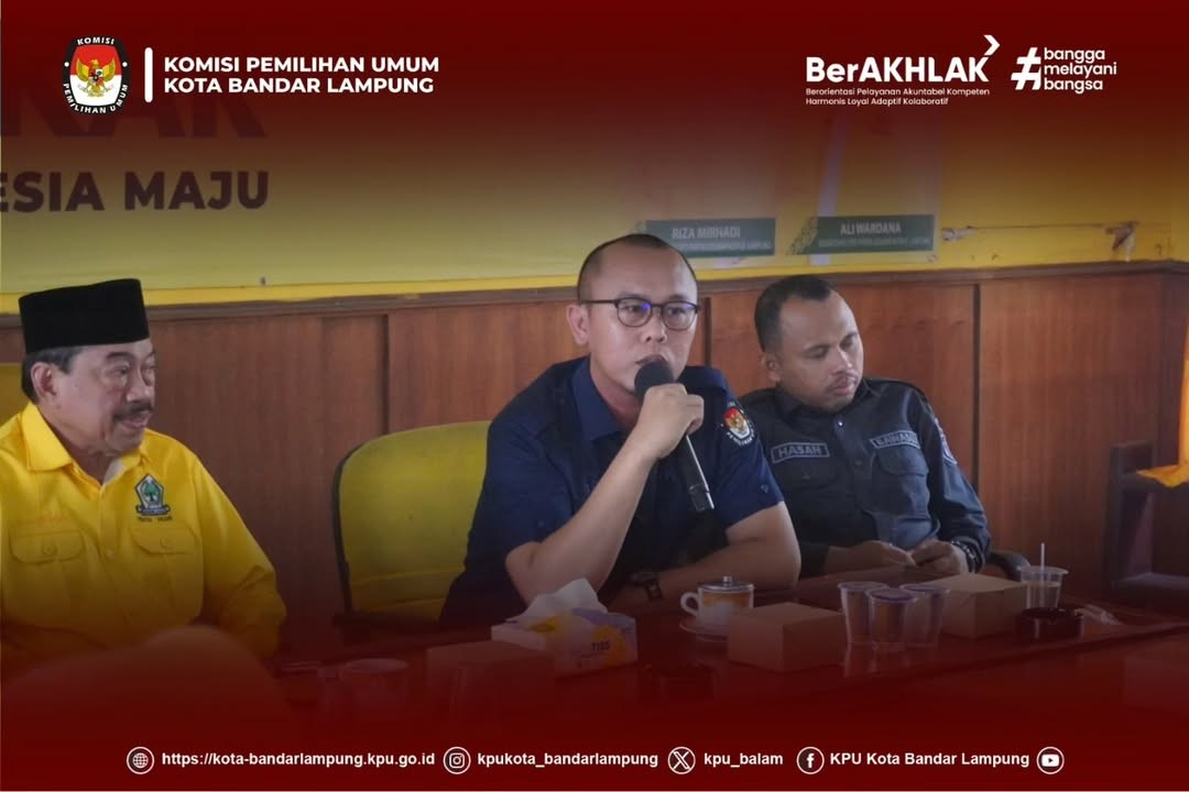 Kegiatan tersebut dihadiri langsung oleh Ketua KPU Kota Bandar Lampung, Arie Oktara, bersama Anggota KPU Kota Bandar Lampung, Een Riansah, Rahmat Junaedi, Robiul, dan Sulastri, serta diterima oleh Plt. Ketua DPD Partai Golkar Kota Bandar Lampung, Riza Mirhadi, dan Sekretaris DPD Partai Golkar Kota Bandar Lampung, Ali Wardana, dalam rangka pelaksanaan pemutakhiran data partai politik secara berkelanjutan.