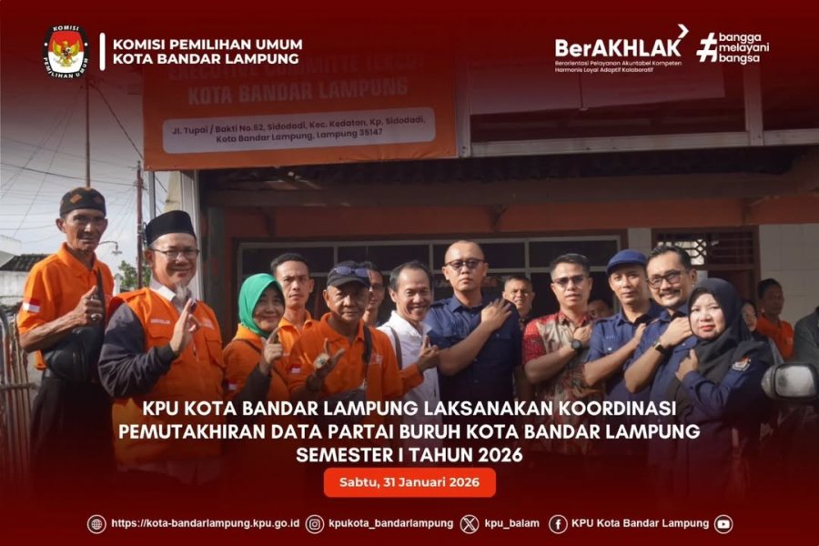 Komisi Pemilihan Umum (KPU) Kota Bandar Lampung melaksanakan kegiatan koordinasi dan silaturahmi terkait Pemutakhiran Data Partai Politik Berkelanjutan Semester I Tahun 2026 ke EXCO Partai BURUH Kota Bandar Lampung sebagai upaya memperkuat komunikasi serta memastikan tertib administrasi kepartaian sesuai dengan ketentuan peraturan perundang-undangan. (31/01/26)