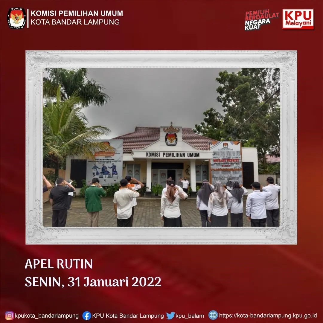 Senin 31 Januari 2022, KPU kota Bandar Lampung melaksanakan apel rutin di halaman kantor KPU Kota Bandar Lampung. Apel ini dipimpin oleh Anggota KPU Kota Bandar Lampung Hamami dan diikuti oleh seluruh staff subkoordinasi serta staff pelaksana dilingkungan KPU kota Bandar Lampung.