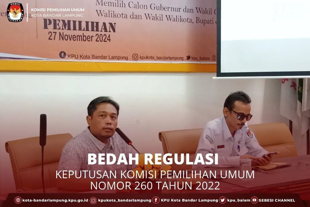 Komisi Pemilihan Umum Kota Bandar Lampung melakukan Bedah Regulasi Keputusan Komisi Pemilihan Umum Nomor 260 Tahun 2022 tentang Pedoman Teknis Bagi Komisi Pemilihan Umum, Komisi Pemilihan Umum Provinsi, dan Komisi Pemilihan Umum Kabupaten/Kota Dalam Pelaksanaan Pendaftaran, Verifikasi, dan Penetapan Partai Politik Peserta Pemilihan Umum Anggota Dewan Perwakilan Rakyat dan Dewan Perwakilan Rakyat Daerah. Kegiatan tersebut dihadiri oleh Ketua, Anggota, Sekretaris, dan staff pelaksana serta PPNPN.