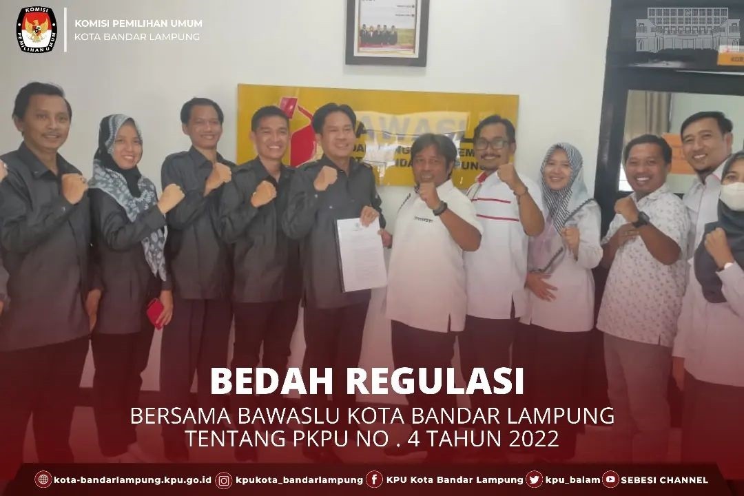 Dalam rangka Pemahaman bersama atas regulasi terkait Pendaftaran, Verifikasi dan penetapan Calon peserta Pemilu Tahun 2024, KPU Kota Bandar Lampung bersama Bawaslu Kota Bandar Lampung senin 01/08/ 2022 bertempat di ruang sidang bawaslu menggelar Bedah Peraturan Komisi Pemilihan Umum (PKPU) Nomor 4 Tahun 2024.