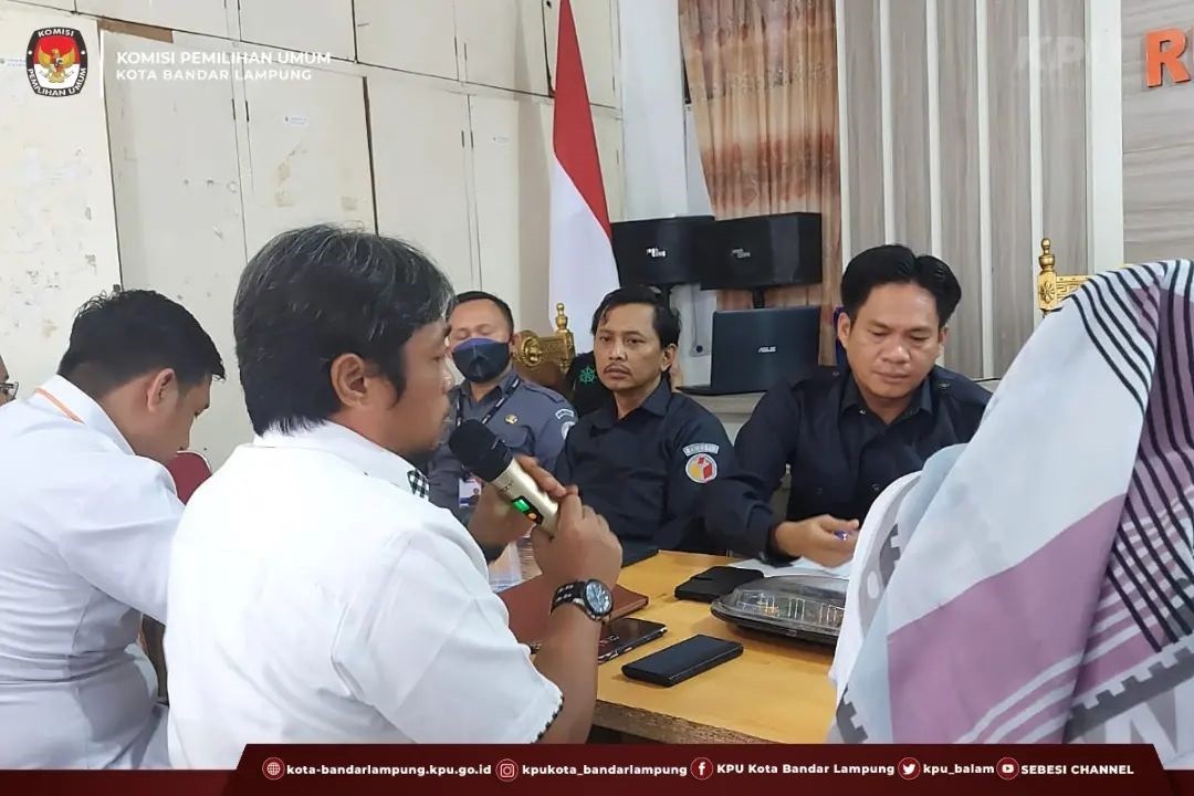 Dedy Triyadi, Ketua KPU Kota Bandar Lampung memberi penjelasan dan kajian hukum atas Tahapan pendaftaran dan Verifikasi Parpol peserta pemilu dengan bersandar pada PKPU 4 Tahun 2022, Lebih lanjut Fery Triatmojo, Anggota KPU Kota Bandar Lampung yang membidangi Divisi Teknis Penyelenggaraan Pemilu menambahkan, secara Teknis terkait proses Pendaftaran ditingkat Pusat hinga Verifikasi andministrasi dan Faktual di Tingkat Kota Bandar Lampung, beliau berharap dengan adanya pertemuan ini tidak dijumpai adanya perbedaan sudut Pandang yang berbeda atas pemahaman regulasi yang dijalankan pada tiap tahapan kegiatan.