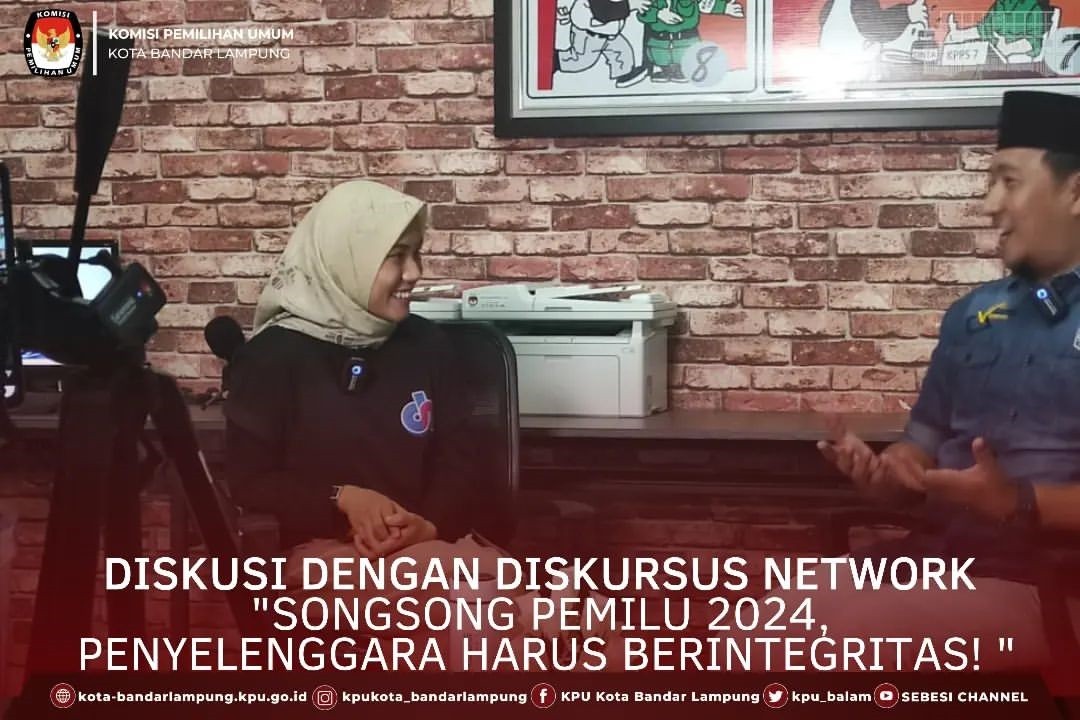 KPU Kota Bandar Lampung bekerjasama dengan Diskursus Network sebagai media digital menyelenggarakan diskusi interaktif online yang disiarkan live Streaming, Jum'at 15/07/2022. hadir pada kegiatan tersebut Fery Triatmojo ketua Divisi Teknis Penyelenggara Pemilu KPU Kota Bandar Lampung sebagai Nara Sumber. Kegiatan yang di pandu Suci Pebrina mengangkat tema "songsong Pemilu 2024 Penyelenggara harus berintegritas".