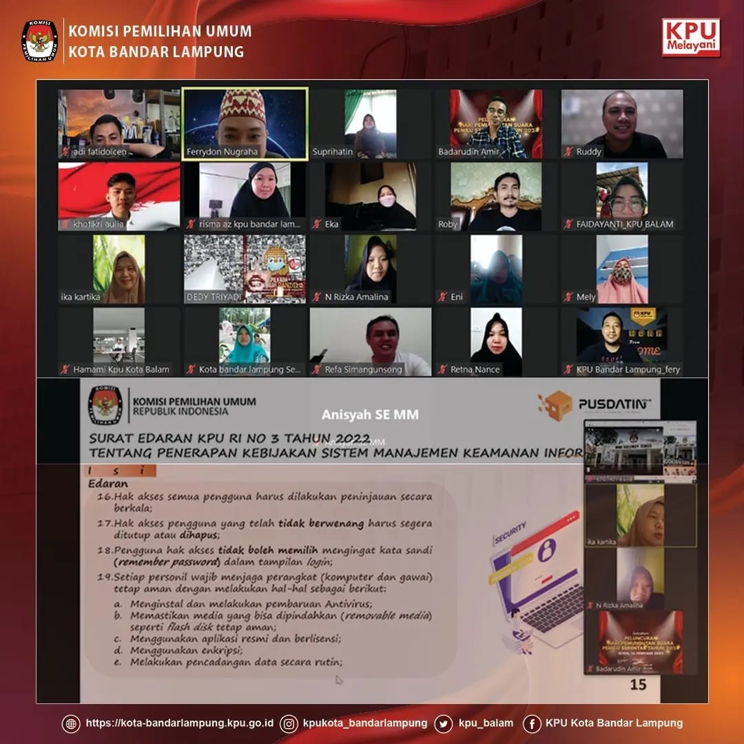 Untuk hari ini Diskusi Rutin Internal dipandu dan dimoderatori oleh Divisi Perencanaan Program dan Data KPU Kota Bandar Lampung yang membahas terkait Surat Edaran KPU RI Nomor 3 Tahun 2022 Tentang Penerapan Kebijakan Sistem Managemen Keamanan Informasi. Bertindak sebagai moderator kegiatan, Kepala Divisi Perencanaan Program dan Data KPU Kota Bandar Lampung Ika Kartika. Dalam diskusi ini banyak terjadi pembahasan terutama terkait tata cara penggunaan pencegahan kebocoran informasi hingga updating malware antivirus yang seharusnya rutin dilaksanakan guna melindungi dan mengcover data data yang sifatnya penting, serta rahasia yang berguna untuk KPU Kota Bandar Lampung.