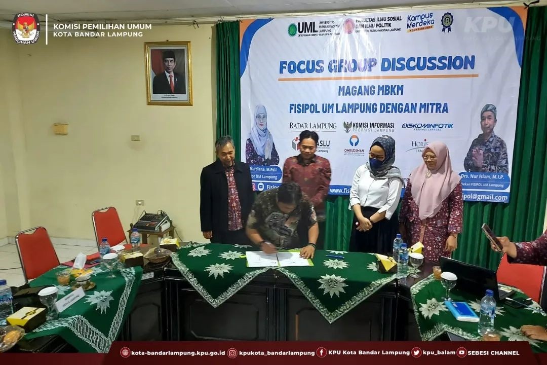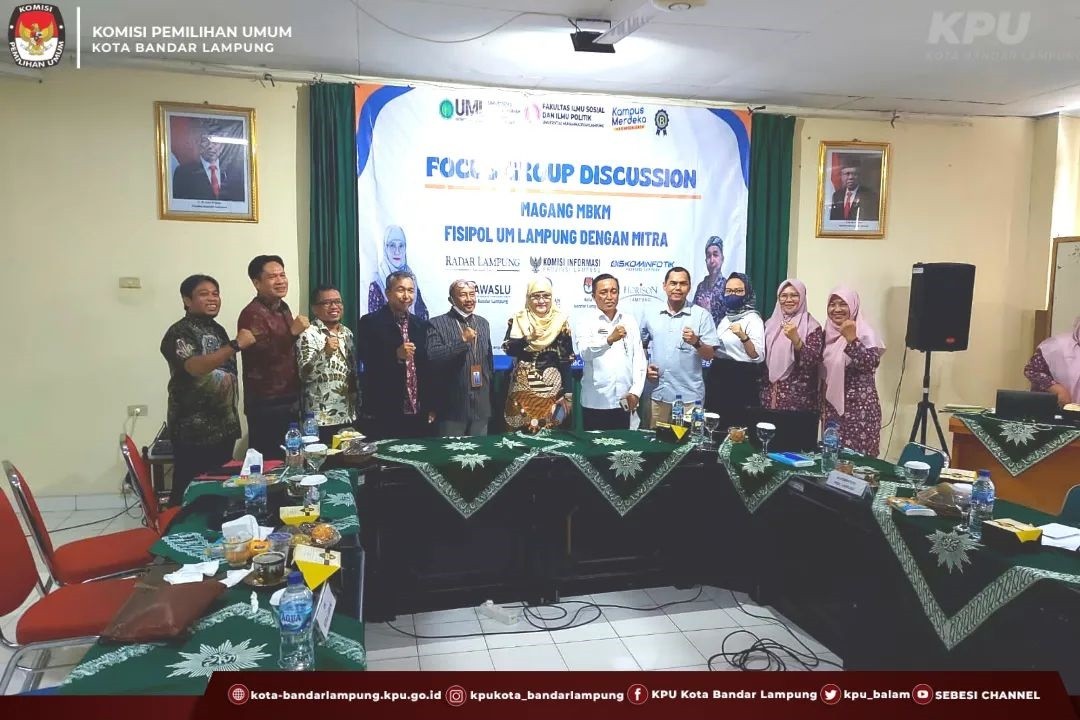 Rabu,14/09/2022 bertempat di Aula Universitas Muhammadiyah Lampung, Ketua KPU Kota Bandar Lampung Dedy Triyadi didampingi Kasubbag Hukum dan SDM Septrianingsih memenuhi undangan FGD Magang MBKM yang diselenggarakan FISIP Universitas Muhammadiyah Lampung, Diskusi yang dihadiri oleh Rektor dan Dekan Dekan dan dihadiri jajaran akademisi Universitas Muhammadiyah Lampung, Ombudsman Provinsi Lampung, Bawaslu Kota Bandar Lampung, Diskominfotik Provinsi Lampung, Radar Lampung, KPID, pihak Hotel Horison lampung.