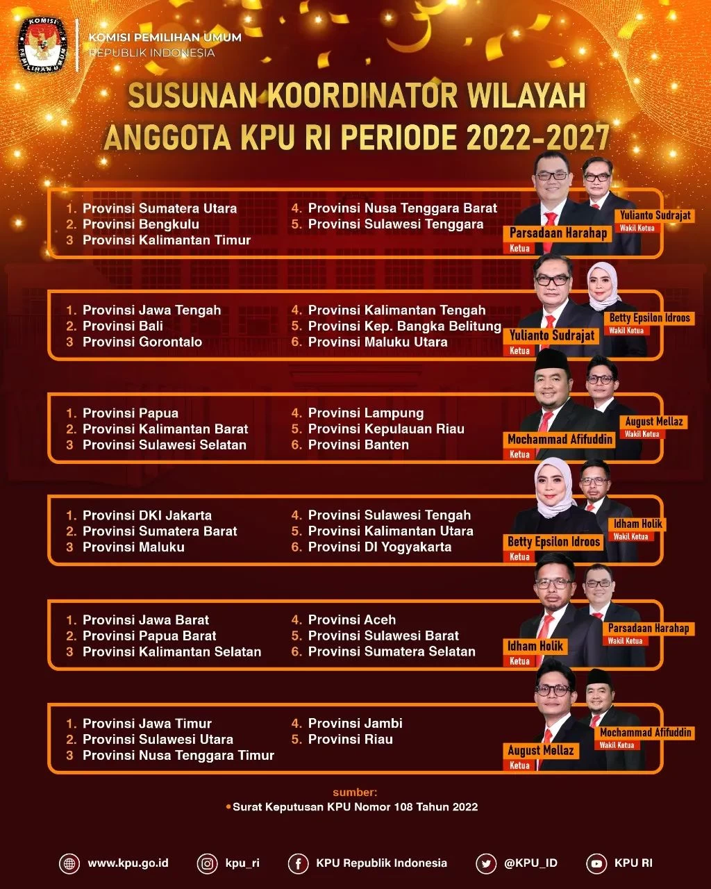 Ketua & Anggota KPU RI Periode 2022 - 2027 beserta koordinator wilayah masing-masing