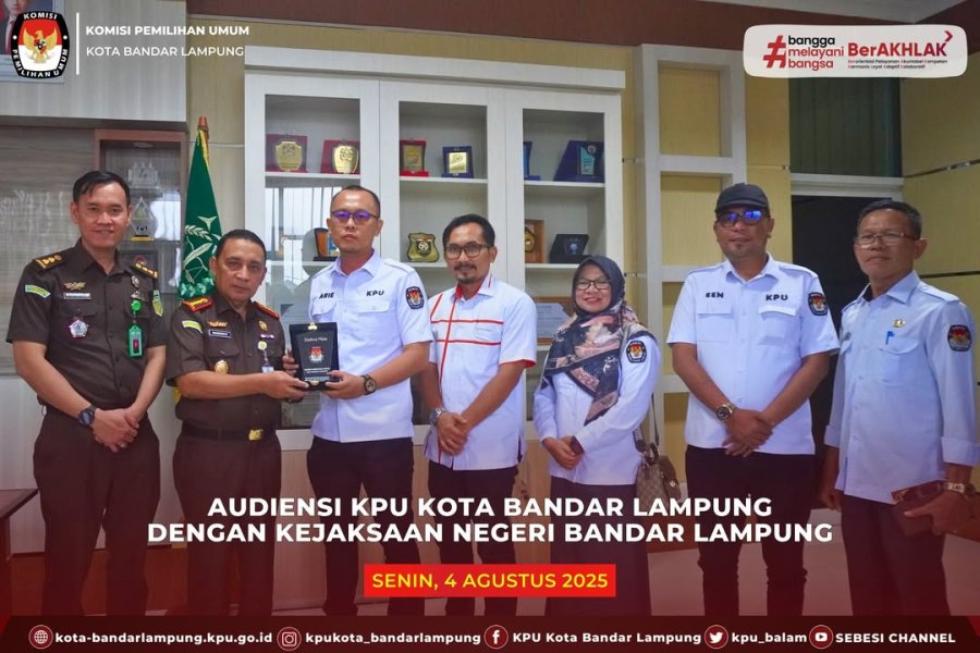 Komisi Pemilihan Umum (KPU) Kota Bandar Lampung melaksanakan audiensi bersama Kejaksaan Negeri Bandar Lampung dalam rangka silahturahmi dan membangun sinergisitas pasca Pilkada Serentak tahun 2024, bertempat di kantor Kejaksaan Negeri Bandar Lampung, Senin (04/08/2025).