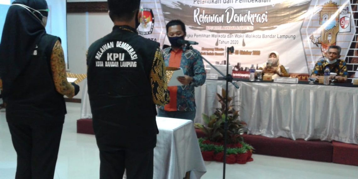 BANDAR LAMPUNG — KPU Kota Bandar Lampung melantik 20 relawan demokrasi dalam pemilihan wali kota dan wakil wali kota Bandar Lampung Tahun 2020 di Tabek Indah, Natar, Lampung Selatan, Jumat (2/10/2020).
