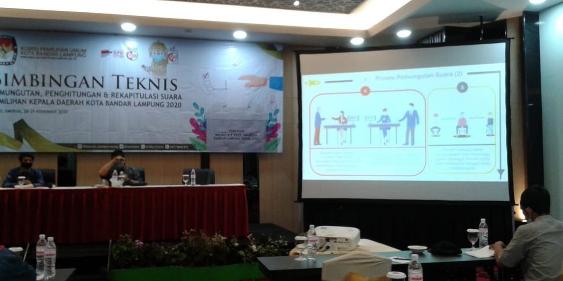 BANDAR LAMPUNG — KPU Kota Bandar Lampung menggelar bimbingan teknis (Bimtek) pemungutan, penghitungan, dan rekapitulasi suara pemilihan kepala daerah Kota Bandar Lampung 2020 di Hotel Emersia, Sabtu (28/11/2020).