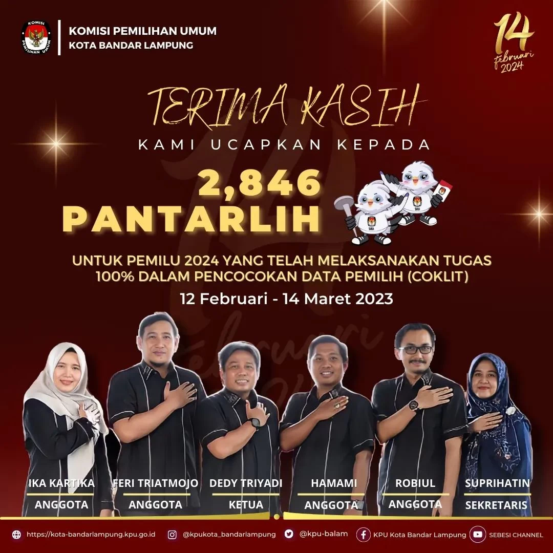 Segenap Jajaran KPU Kota Bandar Lampung Mengucapkan Terima Kasih Kepada 2.846 Pantarlih, serta seluruh PPS dan PPK Se-Kota Bandar Lampung yang telah mensukseskan dan menyelesaikan Pelaksanaan Coklit di Kota Bandar Lampung.