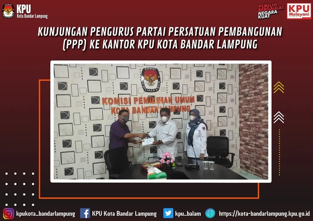 Pada hari ini senin 27 Desember 2020 Ketua KPU Kota Bandar lampung Dedy Triyadi, sekretaris KPU Kota Bandar Lampung Suprihatin, dan jajaran sub Koordinator menerima kunjungan pengurus Partai Persatuan Pembangunan (PPP) Kota Bandar lampung.