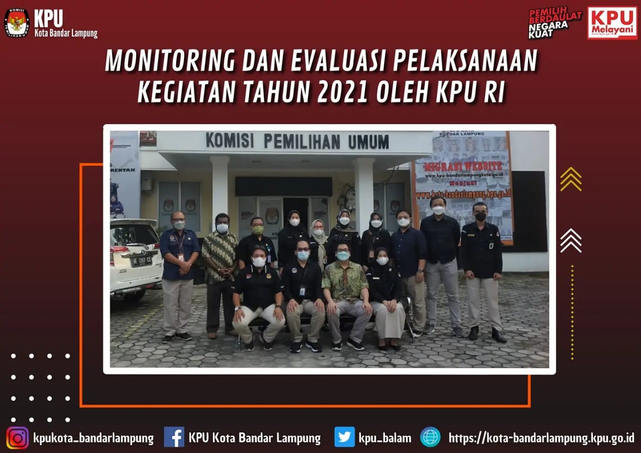 Tim Monitoring dan Evaluasi dari KPU RI Dalam pelaksanaan tugasnya di KPU Kota Bandar Lampung memberikan apresiasi yang cukup baik atas kinerja KPU Kota Bandar Lampung dalam pelaksanaan kegiatan dan anggaran tahun 2021. Serta memberikan motivasi agar lebih meningkatkan lagi kinerja dalam menyambut penyelenggaraan Pemilu dan Pemilihan serentak pada tahun 2024 mendatang.