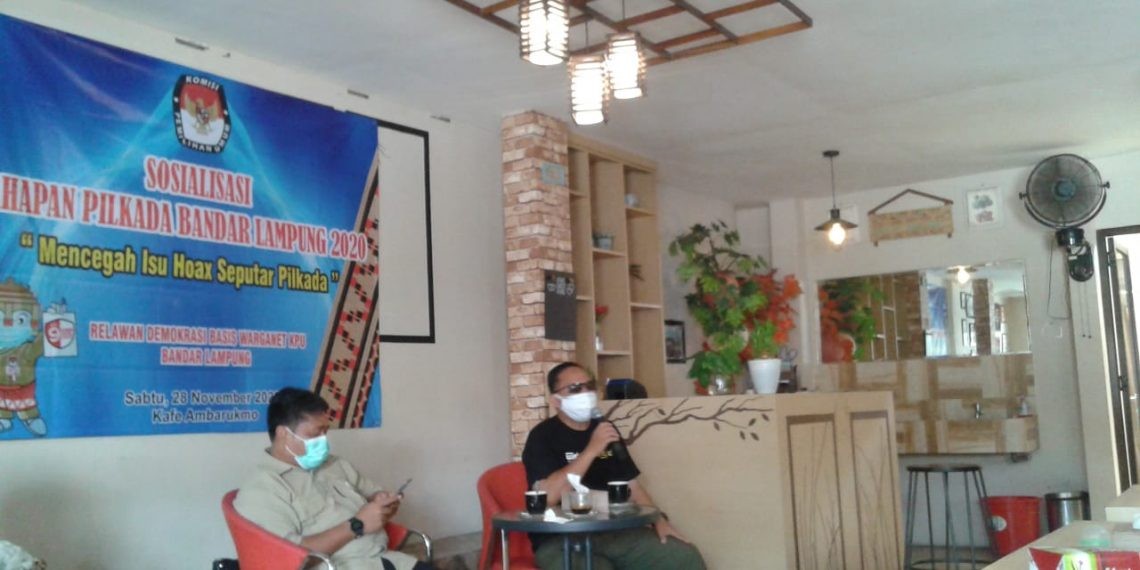 BANDAR LAMPUNG — Relawan Demokrasi KPU Kota Bandar Lampung basis warganet (netizen) melaksanakan kegiatan sosialisasi Pilkada di Cafe Ambarukmo, Kedaton, Bandar Lampung, Sabtu (28/11/2020).