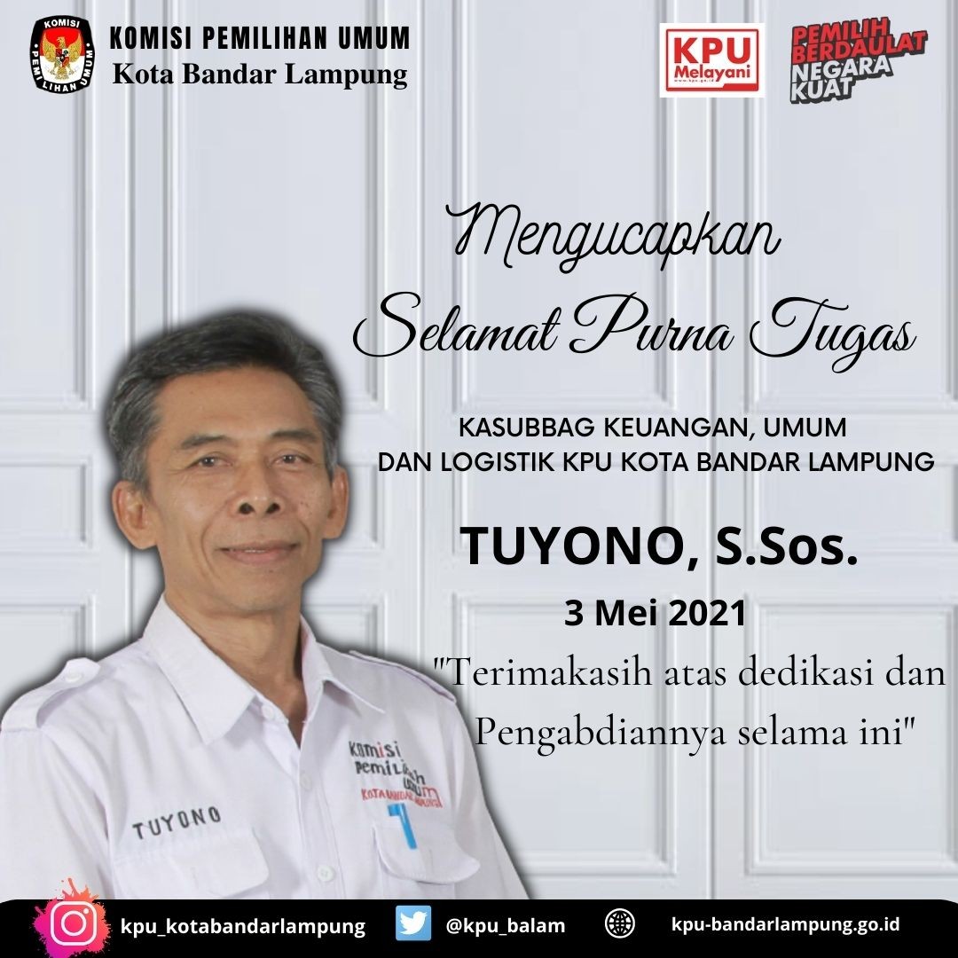Pelepasan Purna Tugas dilaksanakan setelah berakhirnya masa kerja Tuyono. Tuyono mulai bekerja di KPU sejak 1 Januari 2005 dan berakhir pada 30 April 2021. Dengan berakhirnya masa tugas Tuyono, KPU kemudian menugaskan Hasbiyah, S.I.Kom., M.M sebagai Plt. Kasubbag Keuangan Umum dan logistik. Diakhir acara Tuyono menyampaikan kesan kepada seluruh pegawai KPU. Saya selama ini merasakan adanya kerjasama yang baik dengan rekan-rekan selama bekerja, ucapnya. Lebih lanjut ia juga berpesan kepada staf KPU lain agar lebih menghargai pekerjaan, “Hargailah pekerjaan, jangan pernah mengeluh, syukuri bahwa kita masih bisa bekerja dan beraktivitas, karena di luar sana banyak orang yang mengharapkan dan mengantri untuk bekerja, tutupnya. (*SM).