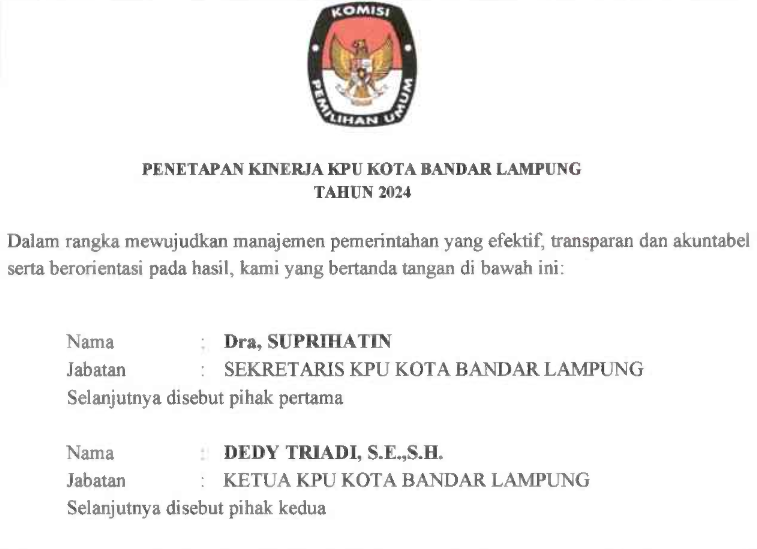 Penetapan Kinerja KPU Kota Bandar Lampung Tahun 2024 (Ibu Suprihatin) Sabtu, 20 Januari 2024 07:00 965 Penetapan Kinerja KPU Kota Bandar Lampung Tahun 2024 Lihat disini Bagikan: Dilihat 965 Kali.