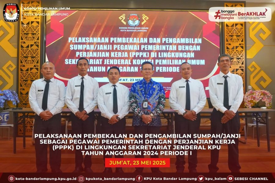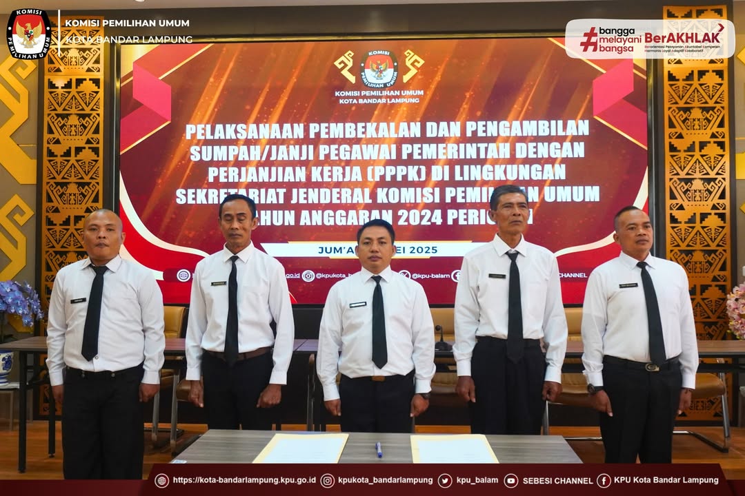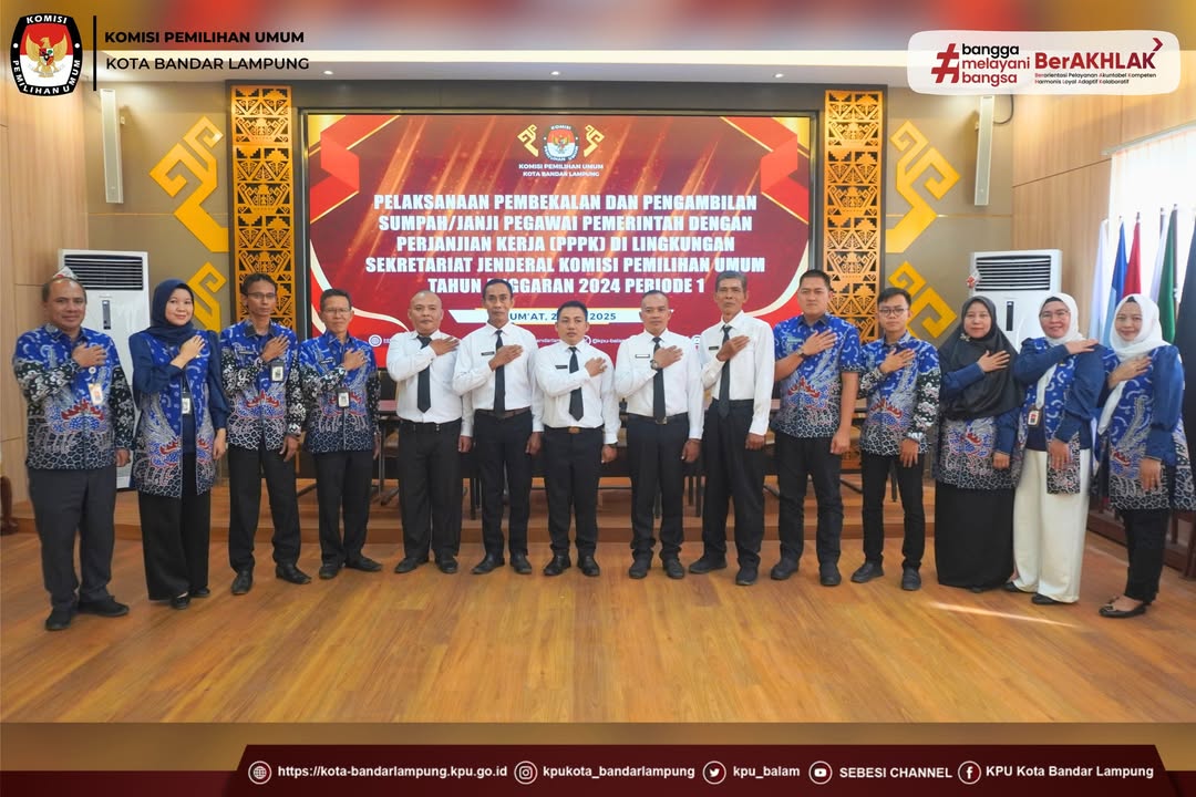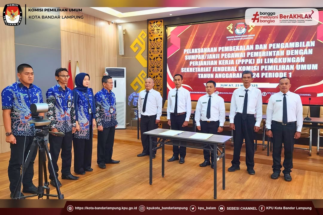 Sekretariat Komisi Pemilihan Umum (KPU) Kota Bandar Lampung melakukan pengambilan sumpah janji sebagai Pegawai Pemerintah dengan Perjanjian Kerja (PPPK) di lingkungan Sekretariat Jenderal KPU Tahun Anggaran 2024 Periode I, Jum'at (23/05/25).