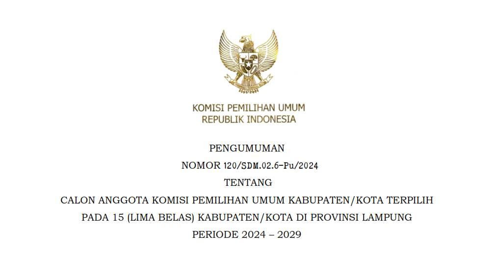 Pengumuman Anggota KPU Terpilih Pada 15 Kabupaten/Kota di Provinsi Lampung