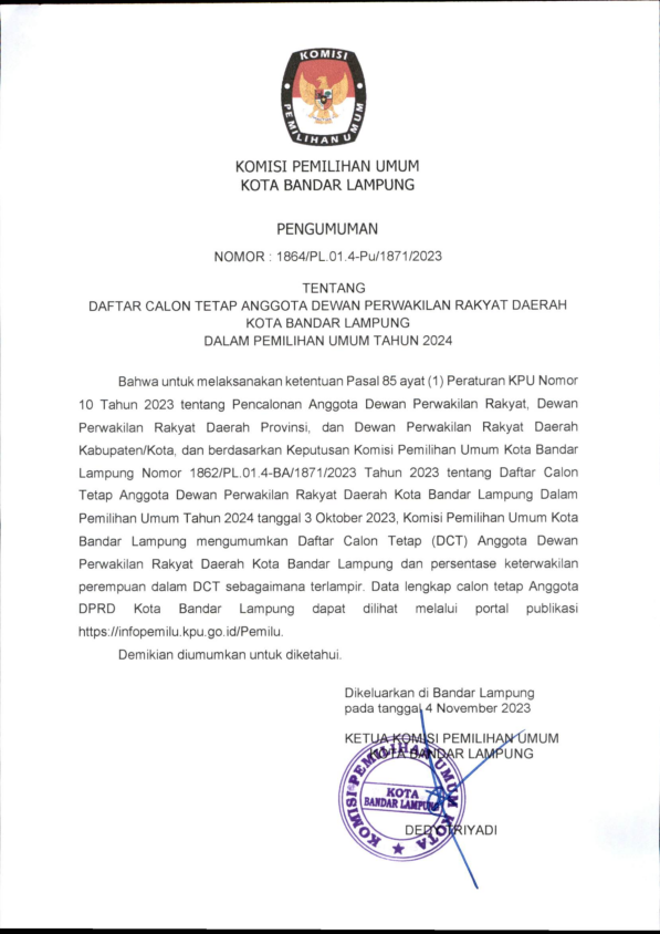 Berikut kami lampirkan Pengumuman dan SK Daftar Calon Tetap (DCT) Anggota DPRD Kota Bandar Lampung Dalam Pemilu Tahun 2024