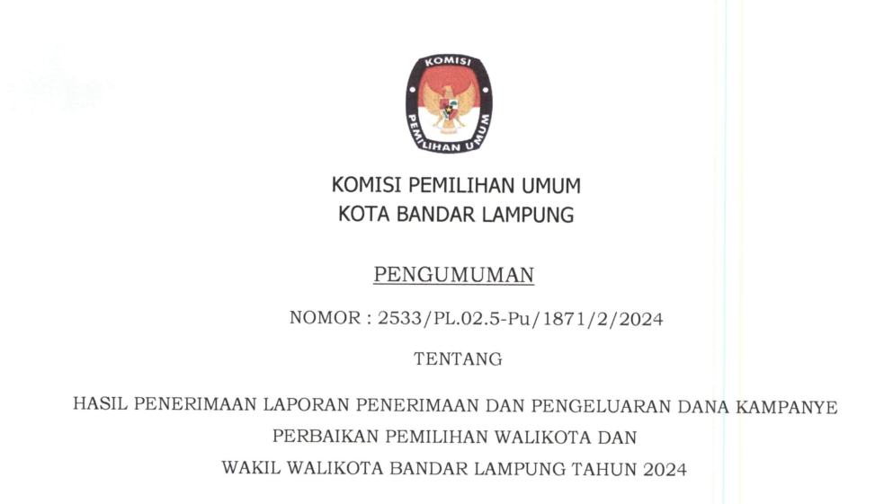 Pengumuman Laporan Penerimaan dan Pengeluaran Dana Kampanye (LPPDK) Perbaikan Pemilihan Walikota dan Wakil Walikota Bandar Lampung Tahun 2024