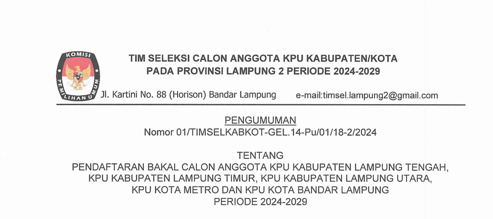 Pengumuman Pendaftaran Bakal Calon Anggota KPU Kota Bandar Lampung Periode 2024-2029