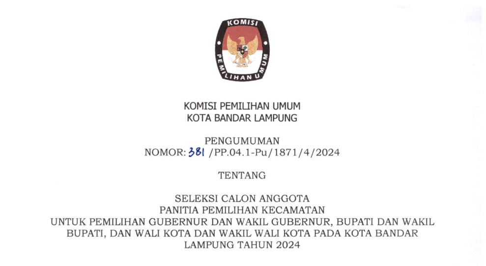Pengumuman Seleksi Calon Panitia Pemilihan Kecamatan Untuk PILKADA 2024