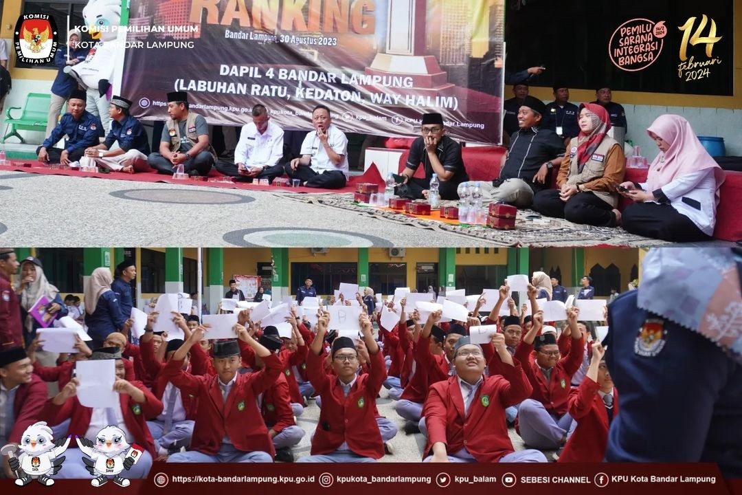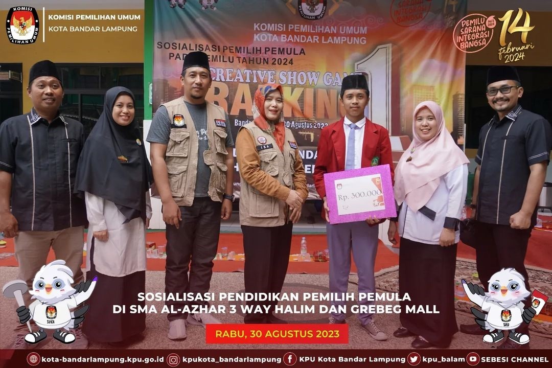 Kegiatan Sosialisasi pendidikan pemilih pemula dilaksanakan sejak pukul 08.30 WIB s.d 11.45 WIB menyasar segmen pemilih pemula yaitu diantaranya para siswa/siswi SMA Al-Azhar 3 Way Halim, Kota Bandar Lampung. Acara kegiatan ini diisi dengan kuis dan tanya jawab yang diberi tajuk acara Ranking I dengan jumlah peserta siswa/siswi yang mengikuti acara sebanyak 180 orang, PPK Dapil 4 berjumlah 15 orang dan PPS yg turut hadir sebanyak 20 orang, dan dewan guru yang hadir ± 9 orang. Total yang terlibat dalam kegiatan Sosialisasi Pendidikan Pemilih Pemula di SMA Al-Azhar 3 Bandar Lampung sebanyak : 224 orang.