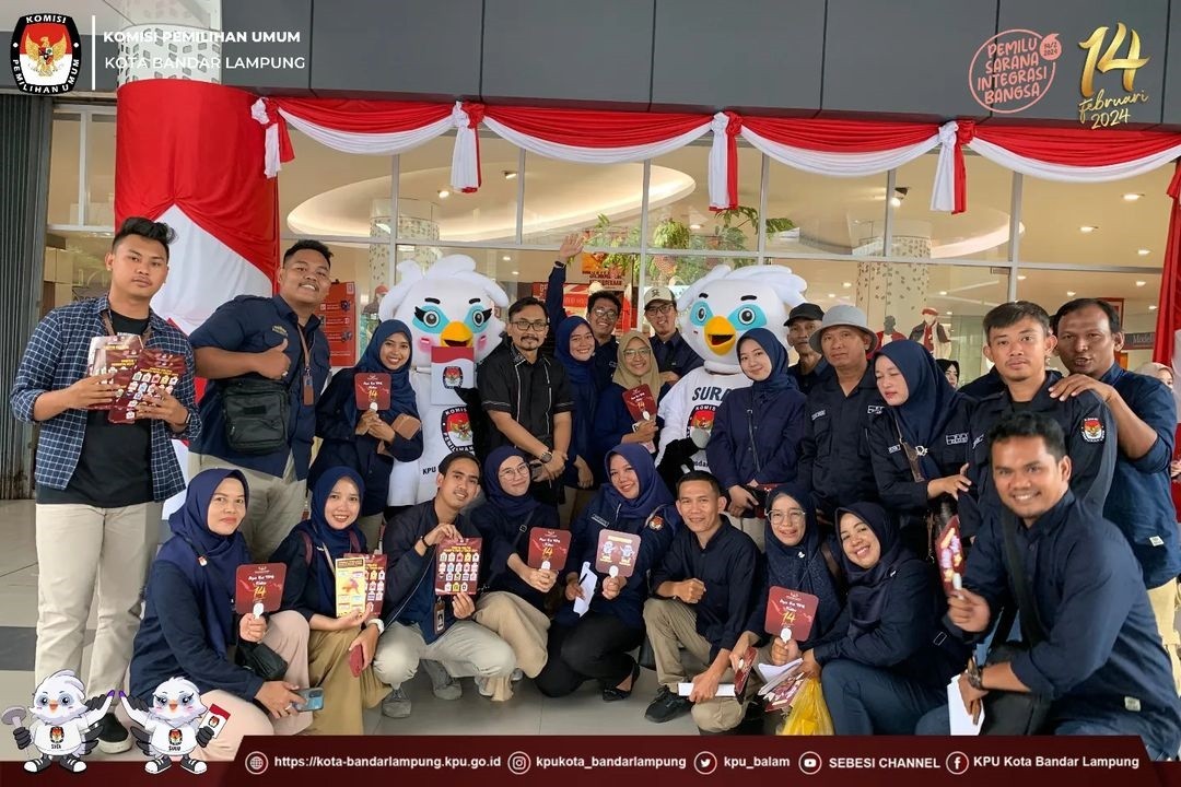 Rangkaian Kirab KPU Kota Bandar Lampung hari ke-3 semakin menarik dan meriah dengan mengadakan Sosialisasi pendidikan pemilih pemula di SMA Al-Azhar 3 Way Halim Bandar Lampung dan kegiatan Grebeg Mall yang merupakan sosialisasi terkait informasi kepemiluan yang dilaksanakan di Mall CIPLAZ Lampung Jl. Z.A. Pagar Alam gedong Meneng, Rajabasa Bandar Lampung, pada Rabu, (30/08/2023).