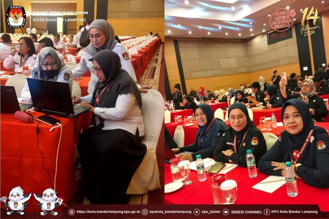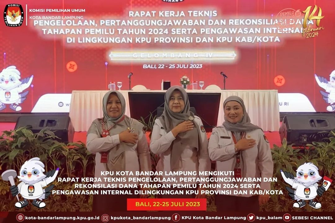 Sekretaris KPU Kota Bandar Lampung Suprihatin didampingi Kepala Subbagian Keuangan dan Logistik, Mely Efriyanti dan Bendahara, Hasbiyah mengikuti Rapat Kerja Teknis Pengelolaan, Pertanggungjawaban dan Rekonsiliasi Dana Tahapan Pemilu 2024 serta Pengawasan Internal di Lingkungan KPU Provinsi dan KPU Kabupaten/Kota Gelombang IV, di Bali, Senin (24/7/2023).