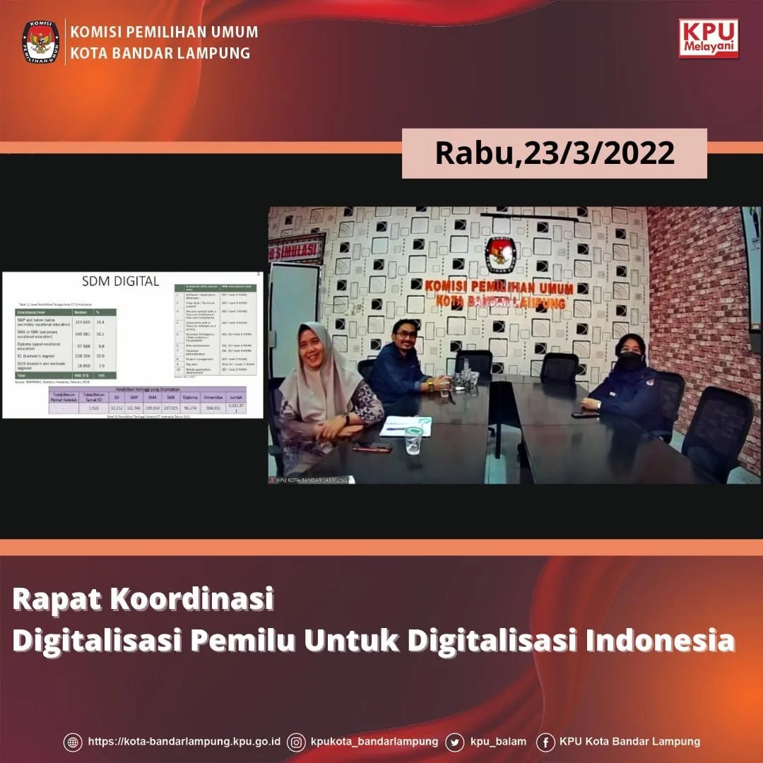 Senin 23/03/22 KPU Kota Bandar Lampung mengikuti kegiatan Rapat Koordinasi Digitalisasi Pemilu Untuk Digitalisasi Indonesia yang diselenggarakan oleh KPU Republik Indonesia. Kegiatan ini di ikuti secara luring oleh KPU Provinsi Se-Indonesia dan secara daring oleh KPU Kab/Kota Se-Indonesia.
