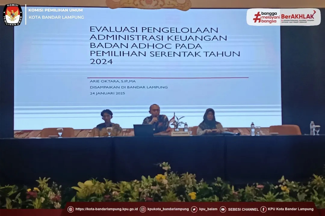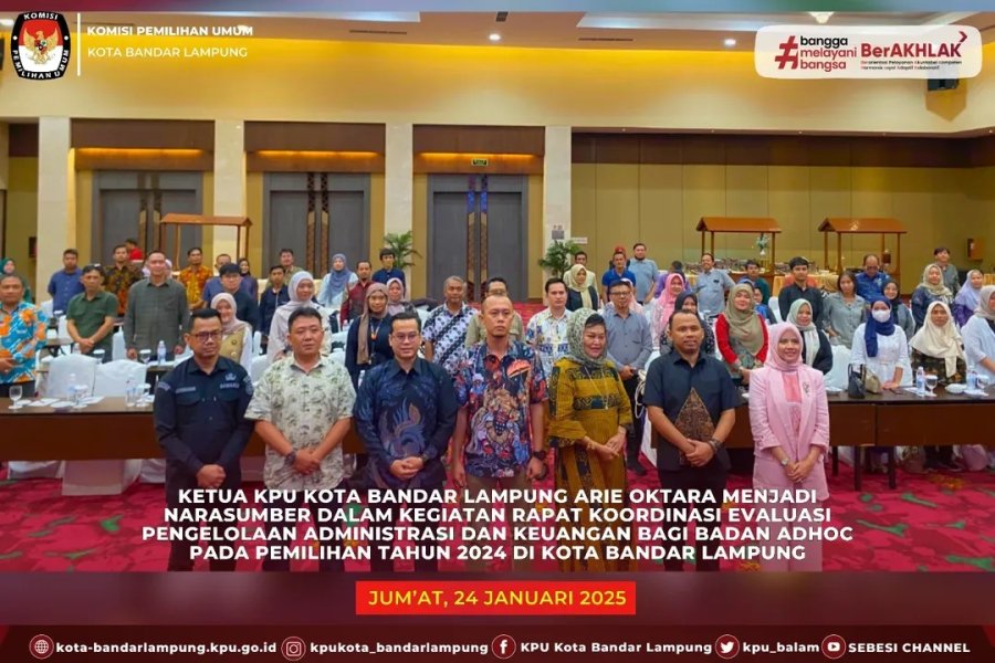 Ketua KPU Kota Bandar Lampung Arie Oktara menjadi Narasumber pada kegiatan Rapat koordinasi evaluasi pengelolaan administrasi dan keuangan bagi badan adhoc pada pemilihan tahun 2024 di kota bandar lampung yang di selenggarakan Bawaslu Kota Bandar Lampung. bertempat di Emersia (24/01/2025).