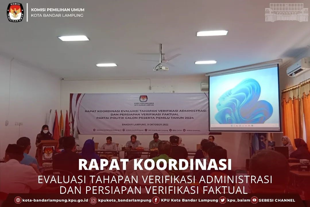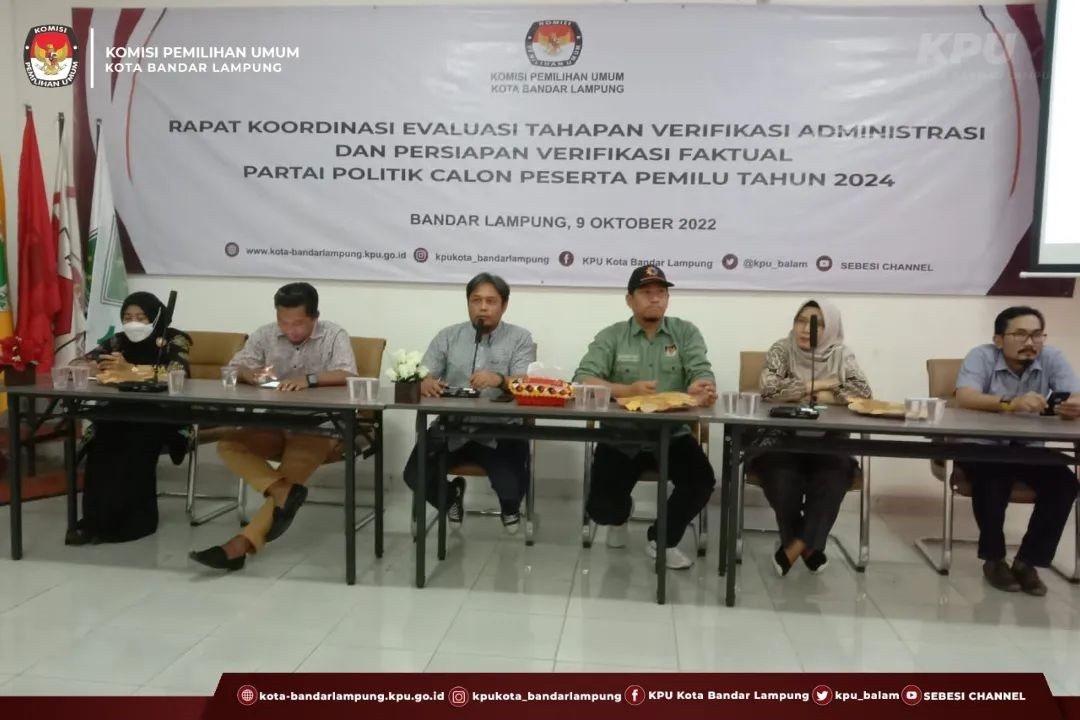 KPU Kota Bandar Lampung melaksanakan Rapat Koordinasi Evaluasi Tahapan Verifikasi Administrasi dan Persipan Verifikasi Faktual Partai Politik Calon Peserta Pemilu Tahun 2024 bertempat di Aula Kantor KPU Kota Bandar Lampung, Minggu (9/10/22). Dalam Kegiatan ini hadir Ketua dan Jajaran Anggota, Sekretaris, Tim Verifikator, dan Staff Pengawas . Kegiatan ini juga turut menghadirkan 20 orang perwakilan Partai Politik Calon Peserta Pemilu 2024.