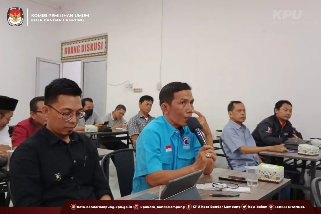 Fery Triatmojo selaku Ketua Divisi Teknis Penyelenggaraan Pemilu KPU Kota Bandar Lampung dalam turut menyampaikan harapannya atas acara yang terselenggara hari ini. Dalam paparannya, Fery mengharapkan adanya komunikasi dua arah yang bersifat timbal balik antara Partai Politik dan KPU Kota Bandar Lampung. Fery juga menyebutkan nama-nama perwakilan Partai Politik yang pada saat ini turut hadir dalam acara penting ini. Dalam slide yang ditampilkan oleh Fery di hadapan para perwakilan Partai Politik, dipaparkan mengenai Alur Tahapan Pendaftaran, Verifikasi dan Penertapan Partai Politik Peserta Pemilu, termasuk mengenai hal apa yang perlu dipersiapkan dan dilakukan oleh masing-masing Partai Politik terutama bagi Partai Politik yang baru pertama kali mengikuti Pemilu seperti; KTP dan KTA, jumlah keterwakilan perempuan dan domisili kantor.
