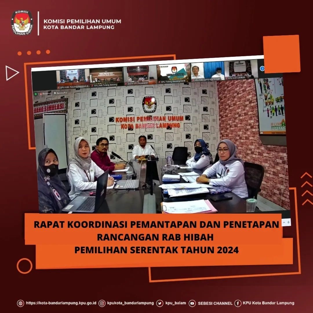 Senin, 30 Mei 2022 KPU Kota Bandar Lampung mengikuti kegiatan Rapat Koordinasi Pemantapan dan Penetapan Rancangan RAB Hibah Pada Pemilihan Serentak Tahun 2024 di ruang simulasi KPU Kota Bandar Lampung. Hadir dalam rapat tersebut Ketua dan Anggota, sekretaris, dan jajaran Kasubbag .