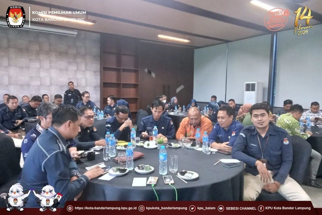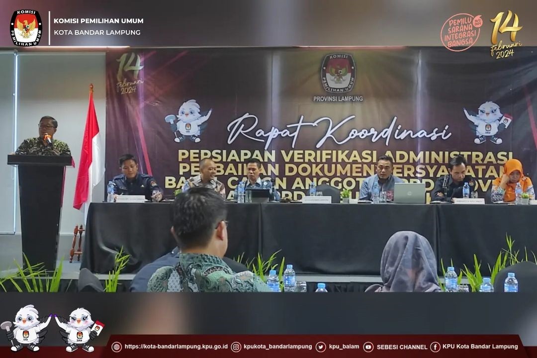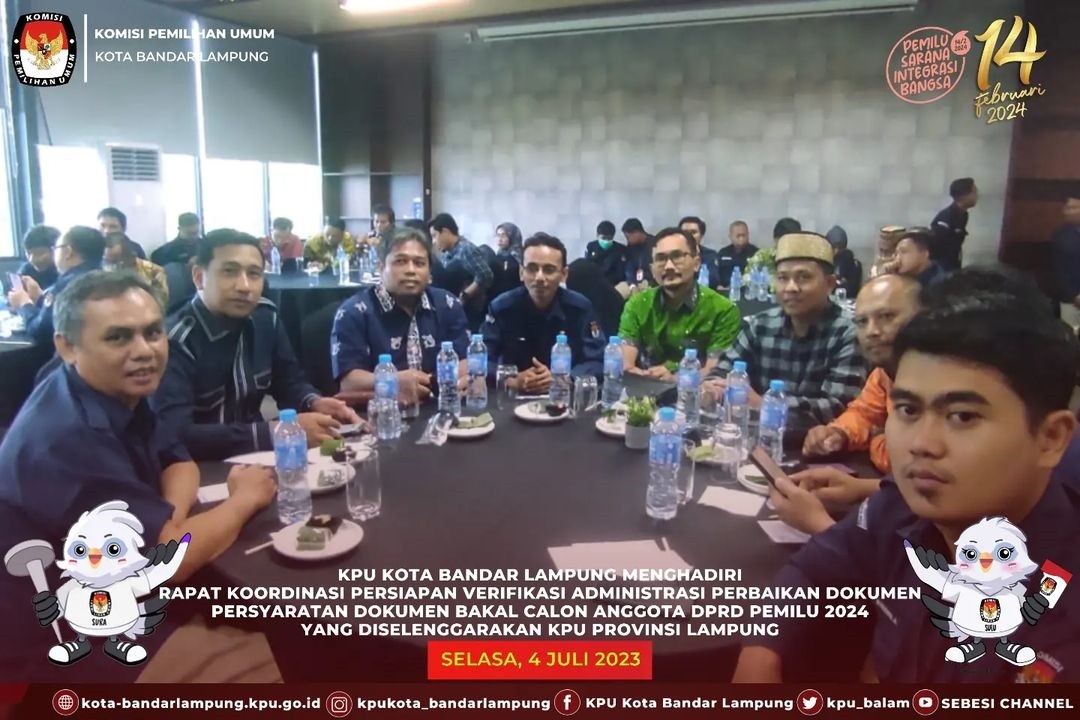 Ketua KPU Kota Bandar Lampung Dedy Triyadi, Ketua Divisi Teknis Penyelenggara Pemilu Fery Triatmojo, Ketua Divisi Hukum dan Pengawasan Robiul, Kepala Sub Bagian Teknis Penyelenggara Pemilu, Partisipasi dan Hubungan Masyarakat Badarudin Amir, dan admin/operator Silon DPRD KPU Kota Bandar Lampung Refa Iswandi S, mengikuti Rapat Koordinasi Persiapan Verifikasi administrasi perbaikan Dokumen Persyaratan Bakal Calon Anggota DPRD Pemilu 2024 yang diselenggarakan KPU Provinsi Lampung, Selasa, 4 Juli 2023, di Ballroom Kyriad Hotel Bandar Lampung.