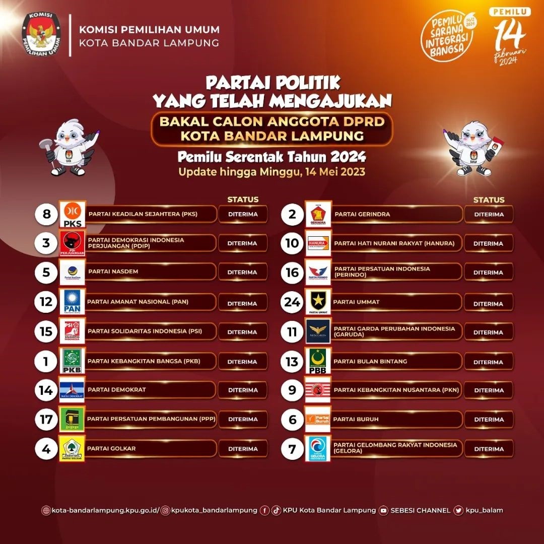 Daftar Partai Politik Peserta Pemilu yang telah selesai mendaftarkan Bakal Calon Anggota DPRD Kota Bandar Lampung untuk Pemilu 2024 pertanggal 14 Mei 2023