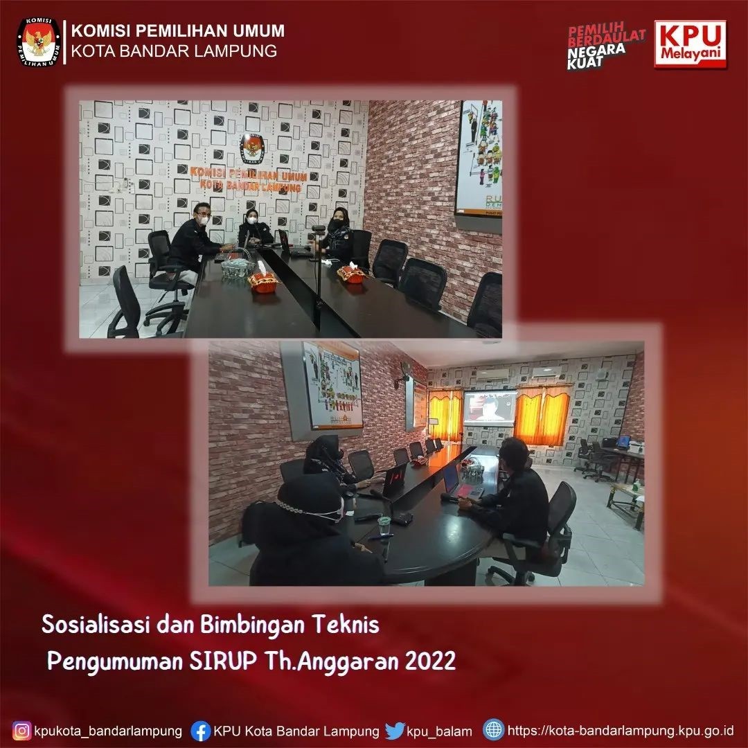 KPU Kota Bandar Lampung Rabu 02 Februari 2022 pukul 09.00 WIB mengikuti sosialisasi dan Bimbingan Teknis Pengumuman SIRUP tahun Anggaran 2022. Kegiatan ini dilakukan secara virtual(daring) di ruang simulasi KPU Kota Bandar Lampung. Hadir dalam kegiatan ini Sekretaris KPU Suprihatin bertindak selaku KPA, Badarudin Amir SubKoordinator Teknis dan HupMas selaku PPK, dan Eni Yulyanti staff pelaksana selaku PBJ.