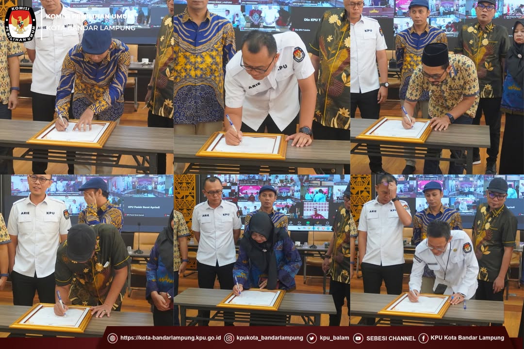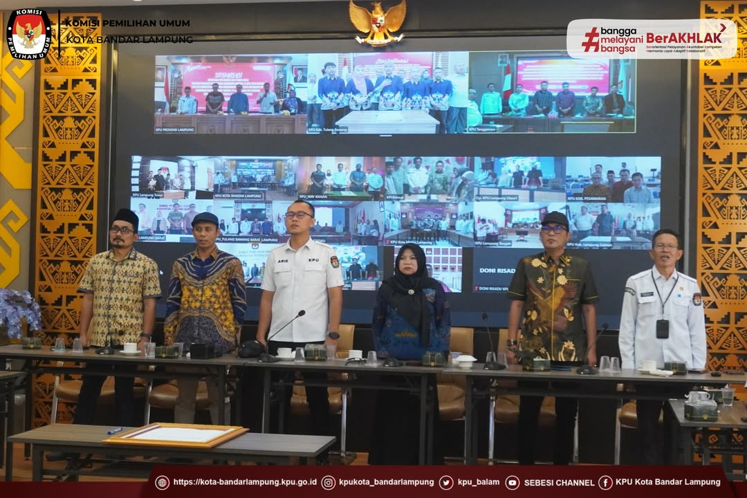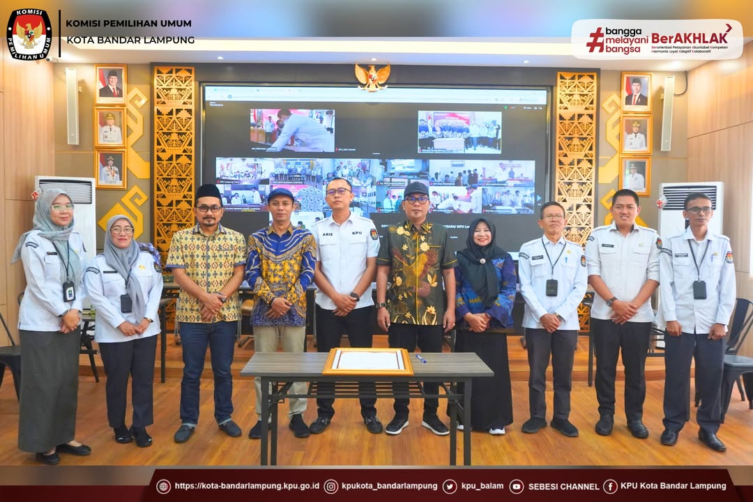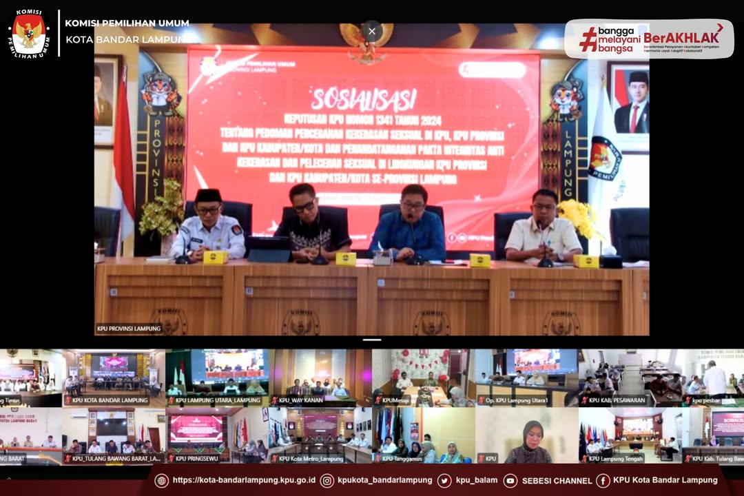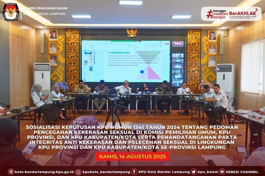 Komisi Pemilihan Umum (KPU) Kota Bandar Lampung mengikuti Sosialisasi Keputusan KPU Nomor 1341 Tahun 2024 tentang Pedoman Pencegahan Kekerasan Seksual di Komisi Pemilihan Umum, KPU Provinsi, dan KPU Kabupaten/Kota serta Penandatanganan Pakta Integritas Anti Kekerasan dan Pelecehan Seksual di lingkungan KPU Provinsi dan KPU Kabupaten/Kota se-Provinsi Lampung, Kamis (14/08/2025).