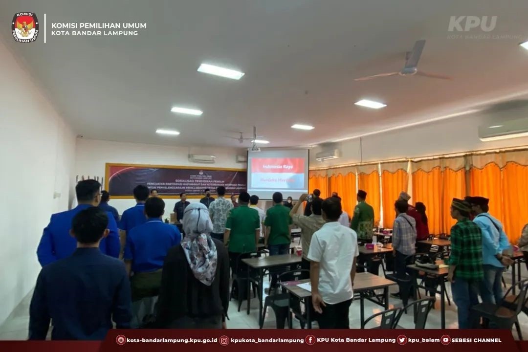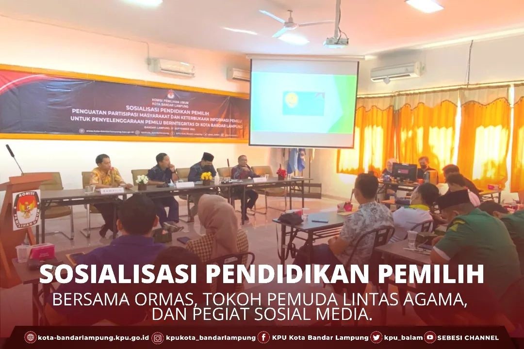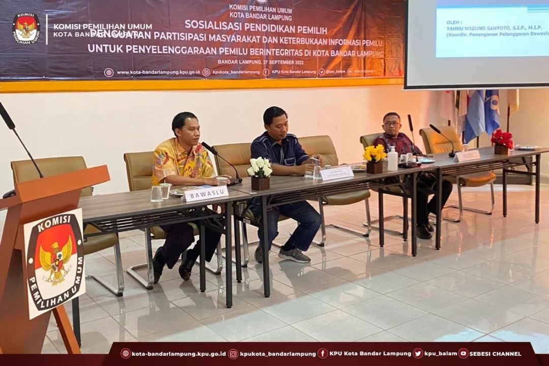 KPU Kota Bandar Lampung melaksanakan Kegiatan Sosialisasi Pendidikan Pemilih bertempat di Aula KPU Kota Bandar Lampung, Selasa (27/9/22). Kegiatan yang mengusung Tema "Penguatan Partisipasi Masyarakat dan Keterbukaan Informasi Pemilu Untuk Penyelenggaraan Pemilu yang Berintegritas di Kota Bandar Lampung" Menghadirkan dua narasumber antara lain Yahnu Wiguno Anggota Bawaslu Kota Bandar Lampung dan Erizal kordiv sosialisasi dan Edukasi Komisi Informasi Provinsi Lampung. Selanjutnya kegiatan ini juga dihadiri oleh Ormas, tokoh pemuda lintas agama dan pegiat sosial media. Kegiatan ini dibuka secara resmi oleh PLH Ketua KPU Kota Bandar Lampung Feri Triatmojo.