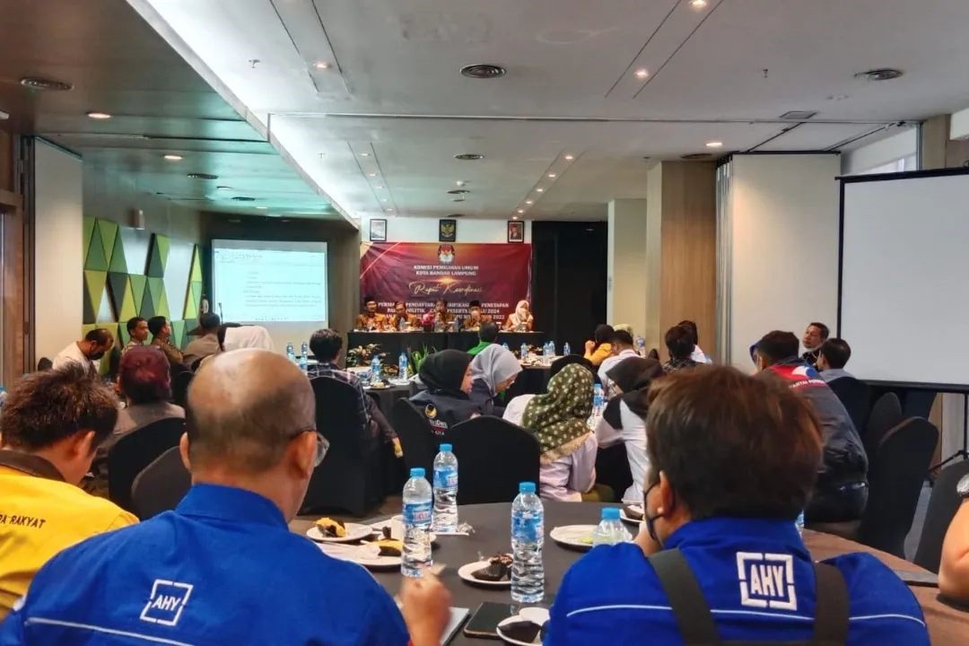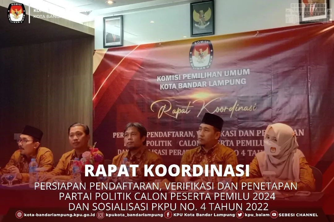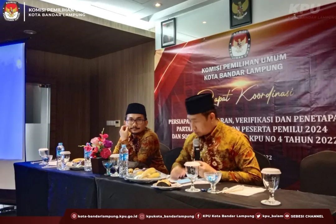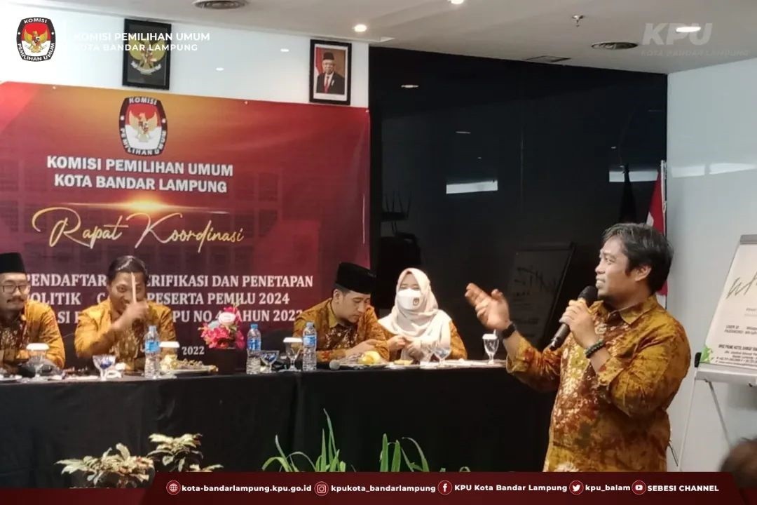KPU Kota Bandar Lampung mengundang Partai politik calon peserta Pemilu 2024 tingkat Kota Bandar Lampung dan Stakeholder Jum'at 29 Juli 2024 bertempat di Hotel Whiz Prime Bandar Lampung. Kegiatan yang bertujuan memberikan pemahaman terkait persiapan Tahapan Pendaftaran, Verifikasi dan Penetapan Partai Politik calon peserta pemilu 2024 dan sosialisasi PKPU No 4 Tahun 2022.