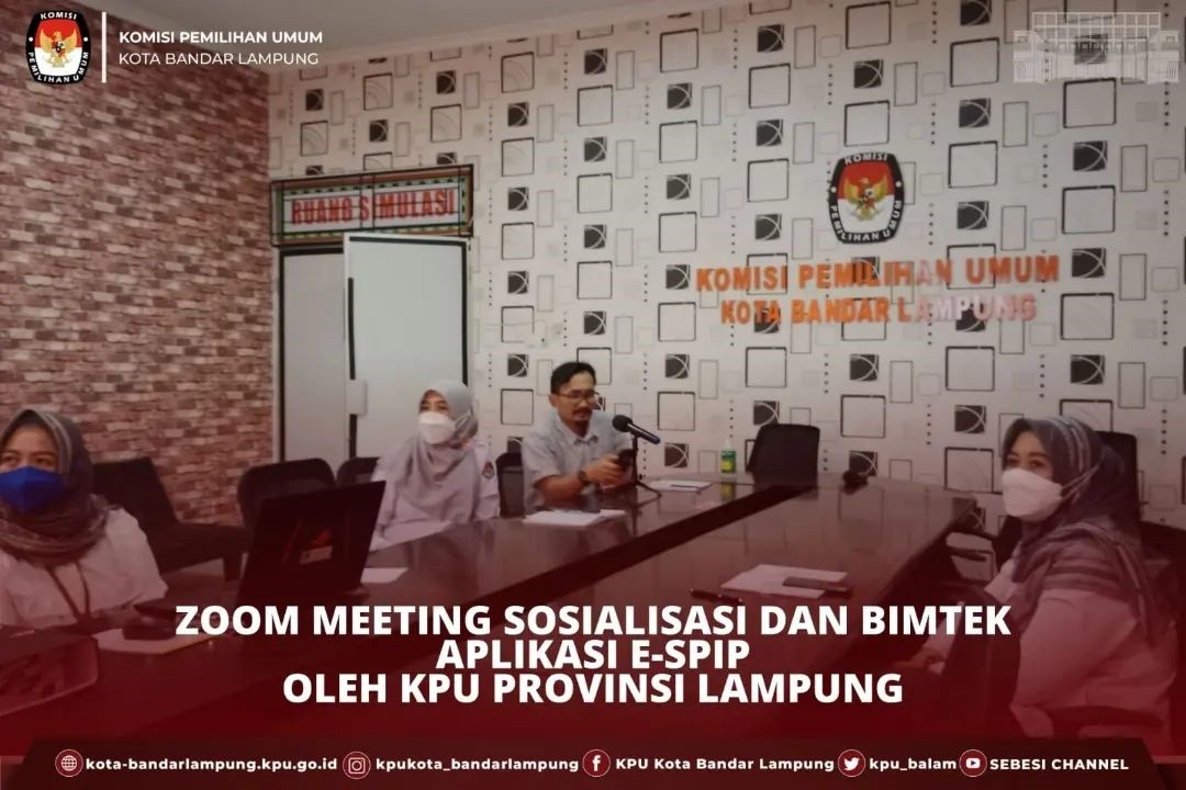 KPU Kota Bandar Lampung mengikuti agenda zoom meeting terkait Sosialisasi serta Bimbingan Teknis penggunaan aplikasi E-SPIP yang diselenggarakan oleh KPU Provinsi Lampung pada hari Kamis, (07/07/2022). Agenda ini diikuti oleh Ketua dan Anggota KPU Kota Bandar Lampung, Sekretaris, Kasubbag Hukum dan SDM serta operator SPIP.