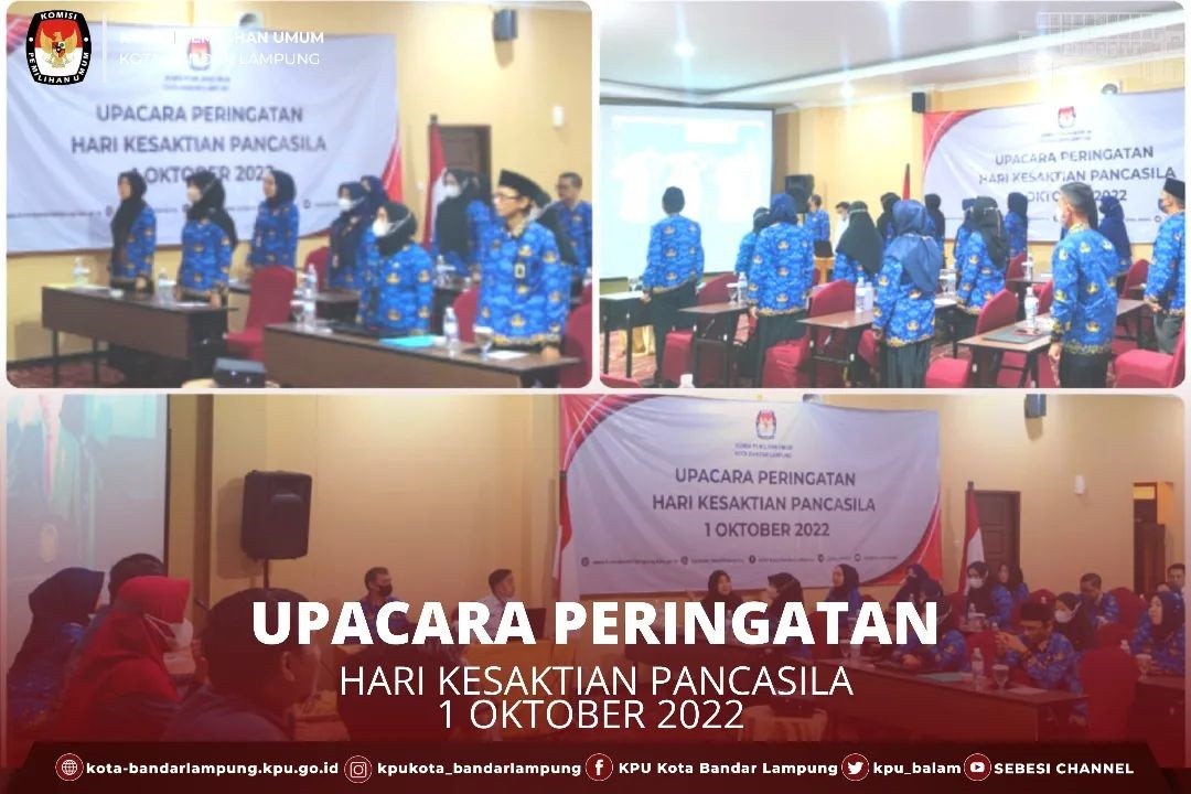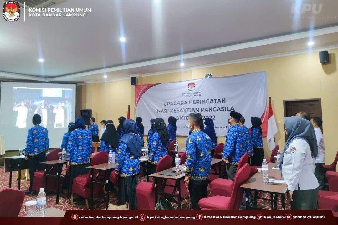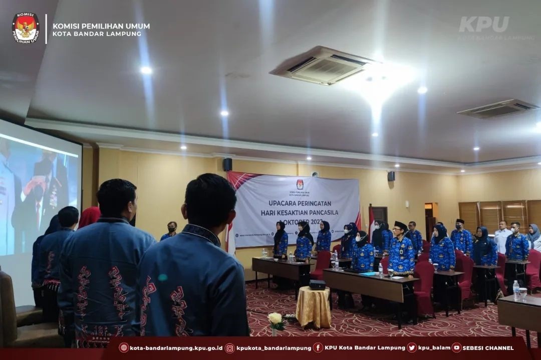 KPU Kota Bandar Lampung Mengikuti Upacara Peringatan Hari Kesaktian Pancasila 1 Oktober 2022. Upacara diikuti secara daring dan dihadiri oleh Ketua dan Jajaran Anggota KPU Kota Bandar Lampung, Sekretaris, Staff pelaksana, dan PPNPN. Upacara berjalan Khidmat dan Lancar.